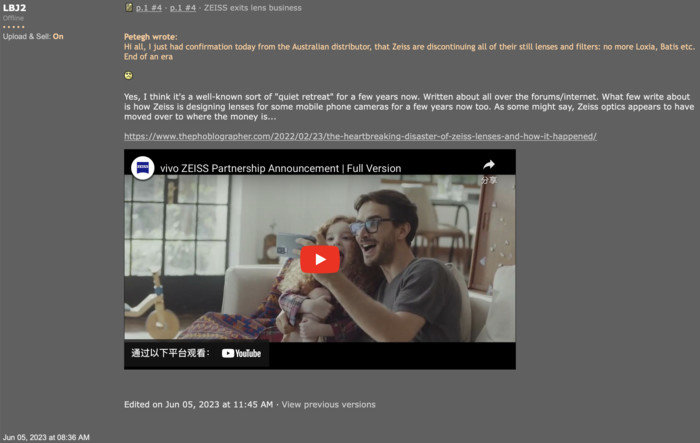 近日,在国外相关文字论坛上,有论坛小组人员就蔡司光学进行了相关讯息分享,根据相关内容显示,这位论坛小组人员分享了一条内容为:“大家好,我今天刚刚得到澳大利亚卡尔蔡司经销商的确认,蔡司即将停产他们所有光学镜头、镀膜、特殊镜片等产品,此后将不会有蔡司Batis、Loxia、Milvus或Otus等系列镜头!”