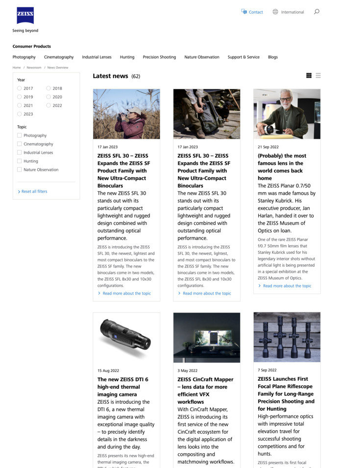回看卡尔蔡司全球官网,你能看到最近的官方信息为,为苹果公司最新发布的Apple Vision Pro设备提供了光学镜片支持,稍早一些,在2023年1月时,蔡司发布全新的 ZEISS SFL 30双筒望远镜产品,更早一些,2022年9月接受著名电影人斯坦利·库布里克捐赠回归的50mm f/0.7超大光圈镜头,还有2022年8月发布的ZEISS DTI 6高端热成像相机等等,蔡司已经很久没有更新关于平面摄制的相机镜头了。