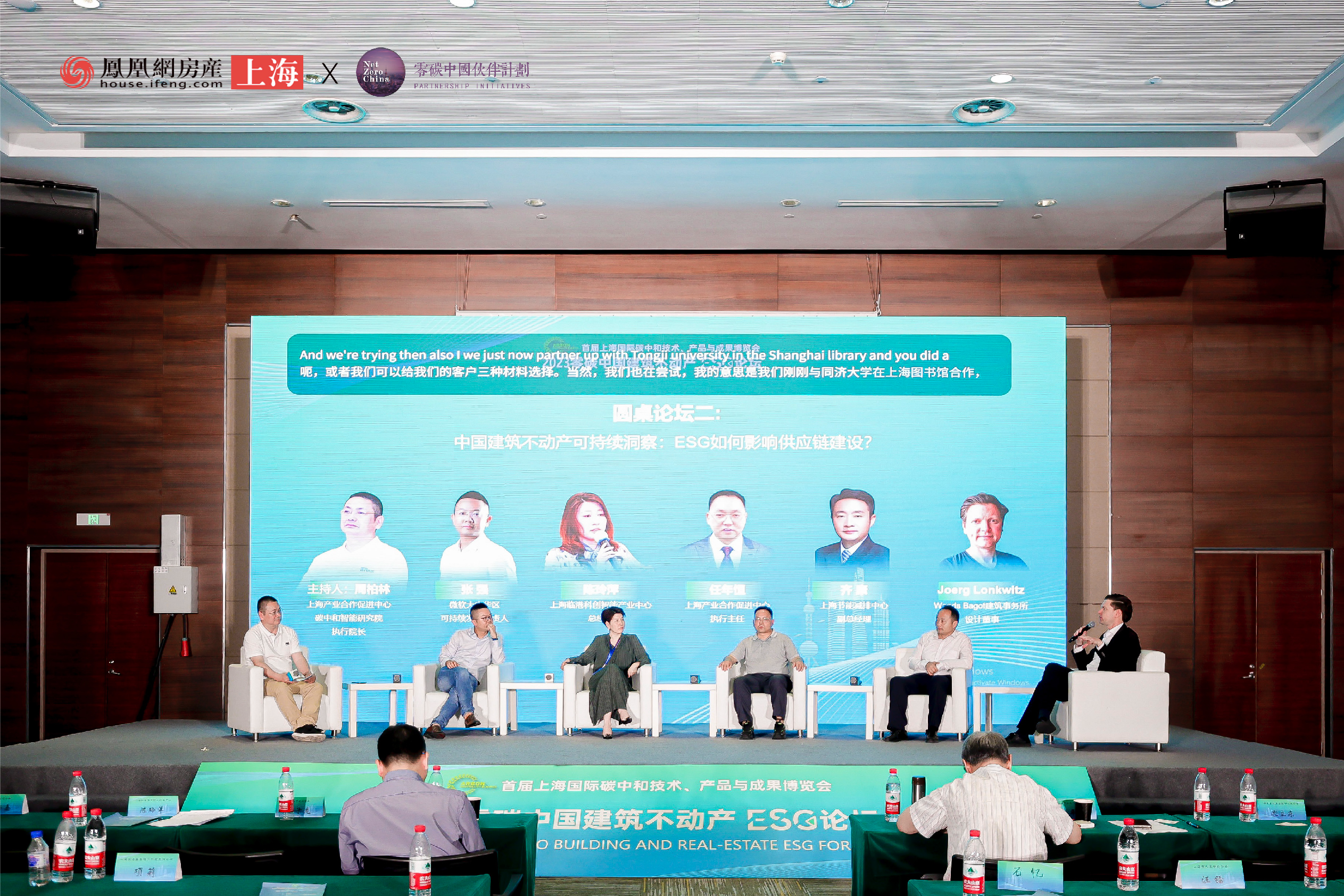 在主题为《中国建筑不动产可持续洞察: ESG如何影响供应链建设?》圆桌论坛环节中,上海产业合作促进中心碳中和智能研究院执行院长周柏林作为主持人,与微软大中华区可持续发展负责人张强、上海临港科创智能产业中心总经理陈玲萍、上海产业合作促进中心执行主任任年恒、上海节能减排中心副总经理齐康、Woods Bagot伍兹贝格建筑事务所设计董事Joerg Lonkwitz 5位嘉宾共同探讨ESG对全球产业链的影响。