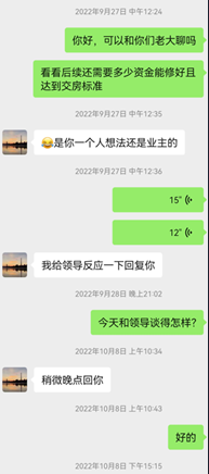 从双方的沟通记录看,2022年9月起,陈女士便开始约开发商负责人蒋总,但直到2023年2月10日,她及其他共5位业主,才真正见到蒋总。“当时也提到希望内部保交楼,还提出其他建议。”