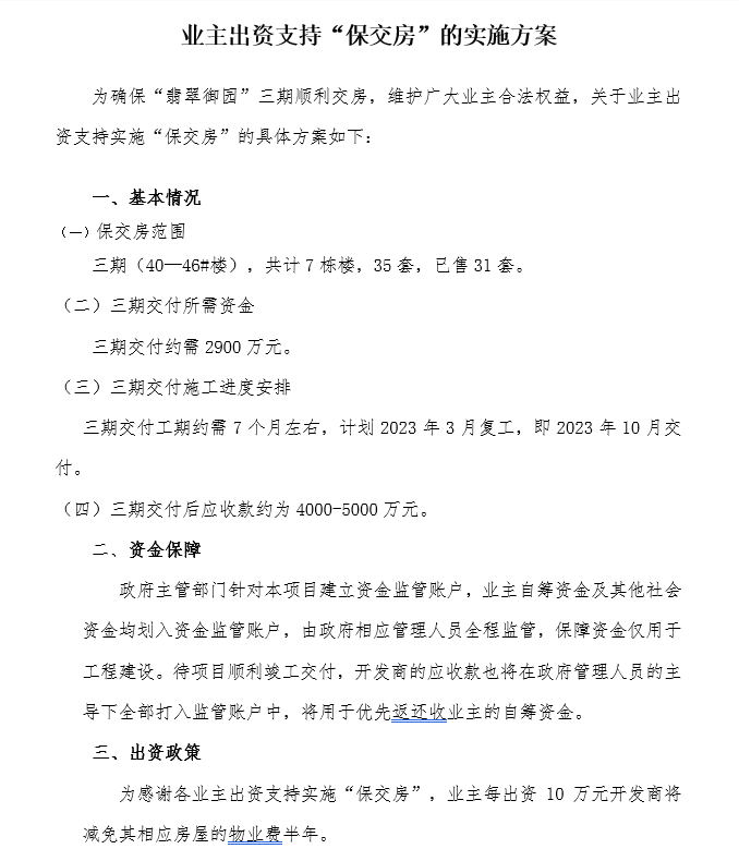 陈女士及其他业主称,当初在协商交楼事宜时,有业主甚至提出,想帮忙共同凑钱,在有关方面的见证和督促下,促使开发商能完工交楼,甚至还拟定该项目《出资支持保交房的实施方案》。