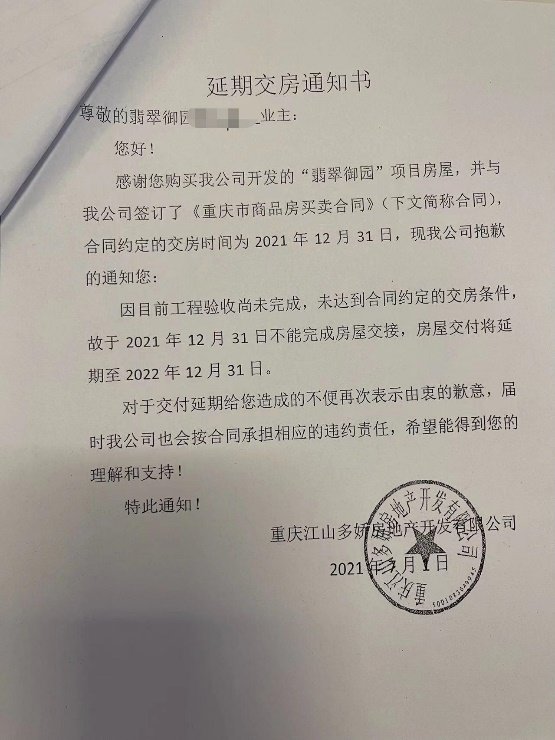但是,在2021年12月10日,陈女士一家收到署名为重庆江山多娇房地产开发有限公司邮寄到家的《延期交房通知书》,称因目前工程验收尚未完成,未达到合同约定交房条件,交付将延期至2022年6月30日。