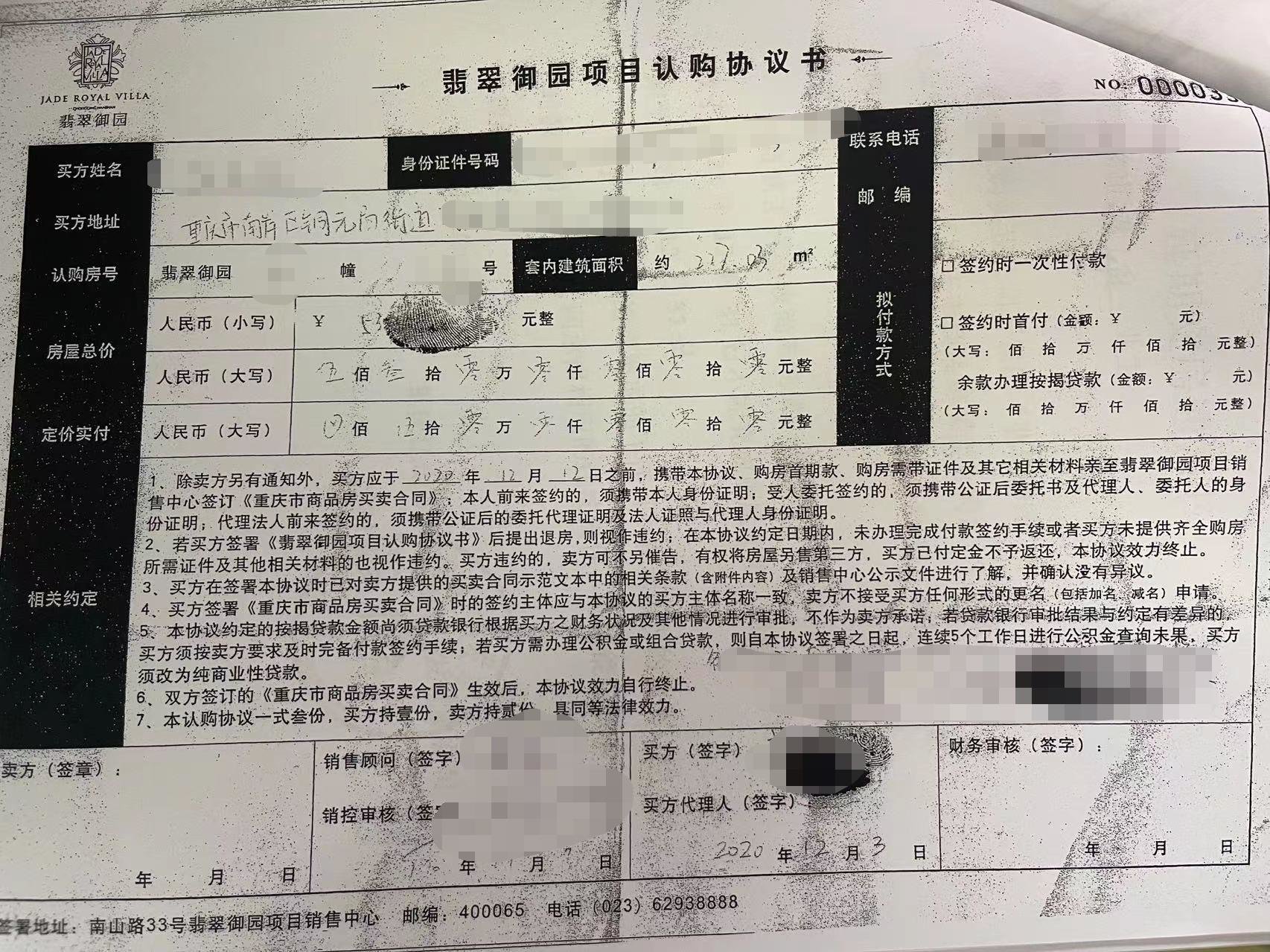 陈女士说,2020年11月19日,在售房部交付3万元“诚意金”后,拿到一张盖有“重庆江山多娇房地产开发有限公司翡翠御园销售部”印章的收据。