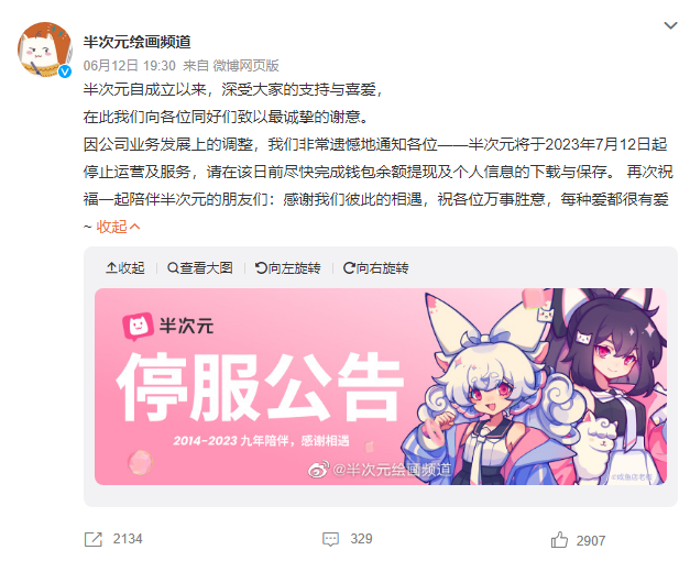 因公司业务发展上的调整,我们非常遗憾地通知各位——半次元将于2023年7月12日起停止运营及服务,请在该日前尽快完成钱包余额提现及个人信息的下载与保存,停止运营后APP及官方网站将无法登录及访问。