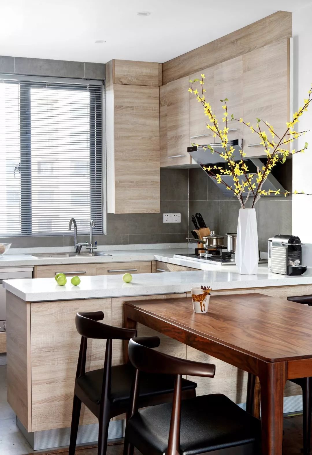 ▲实木餐桌挨着厨房操作台布置,以开放式的设计,为主人打造了一个宽敞舒适而方便的烹饪与用餐空间。厨房靠窗布置,装上百叶帘让光线进入又保障了室内空间的私密感;在U字形操作台的布局下,操作台连着餐桌,摆上陶艺花瓶,让生活实用而又有诗意情趣感。
