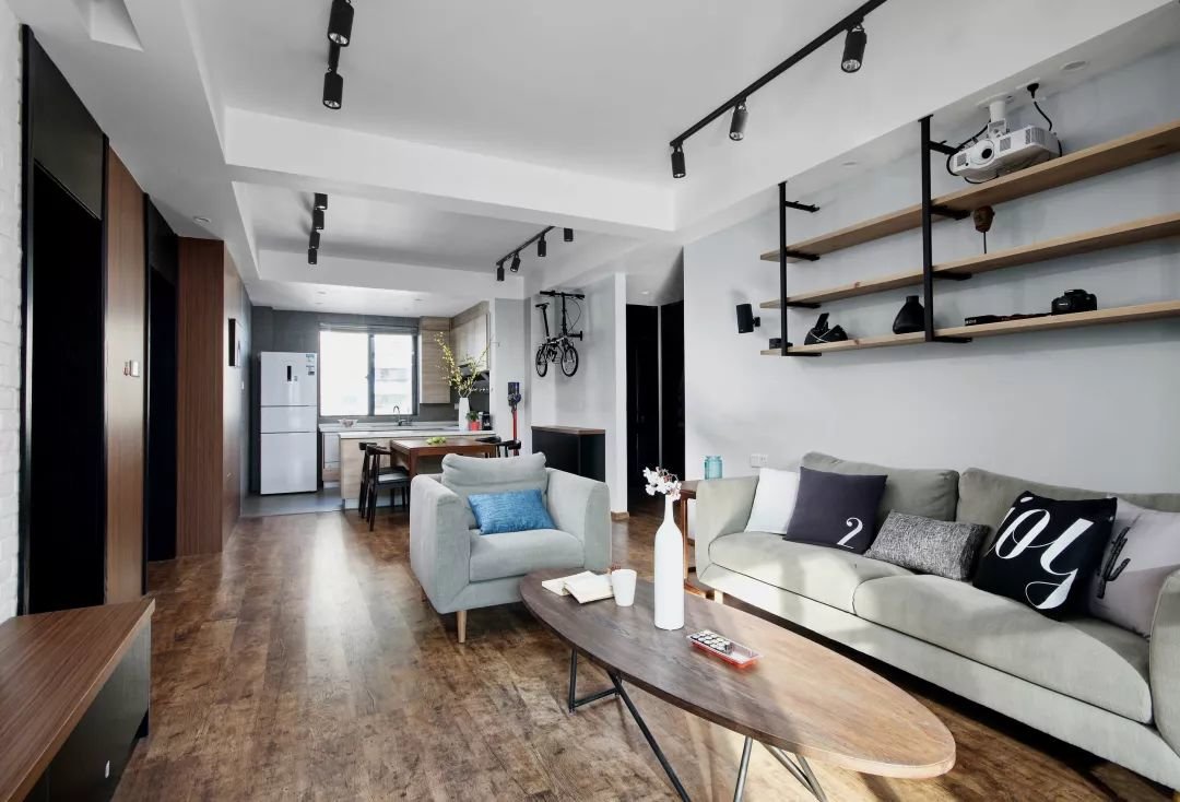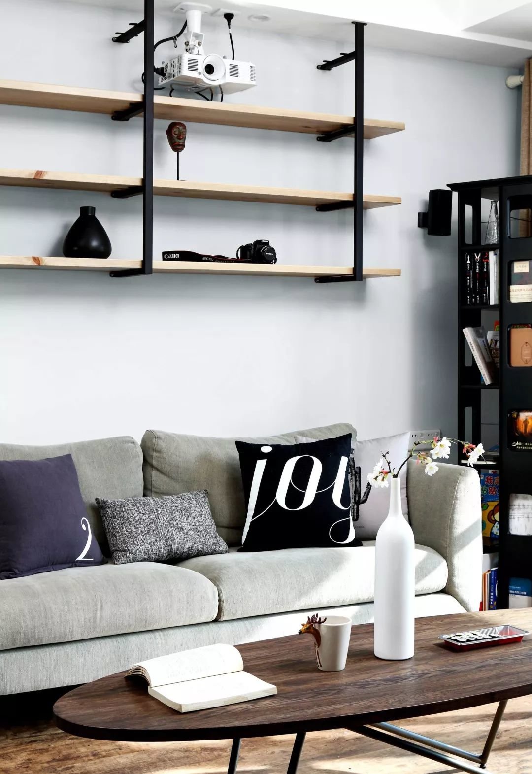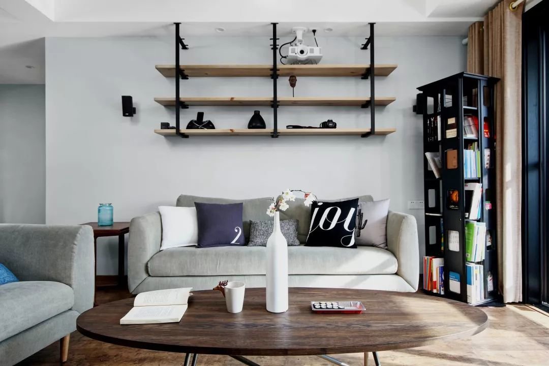 ▲客厅在木地板的空间下,布置椭圆形的实木茶几,还有灰色布艺沙发,沙发墙上装一个黑色铁架+实木搁板的展示架,并在上方装了一个投影仪,为主人提供了一个简约而又个性的空间气质。
