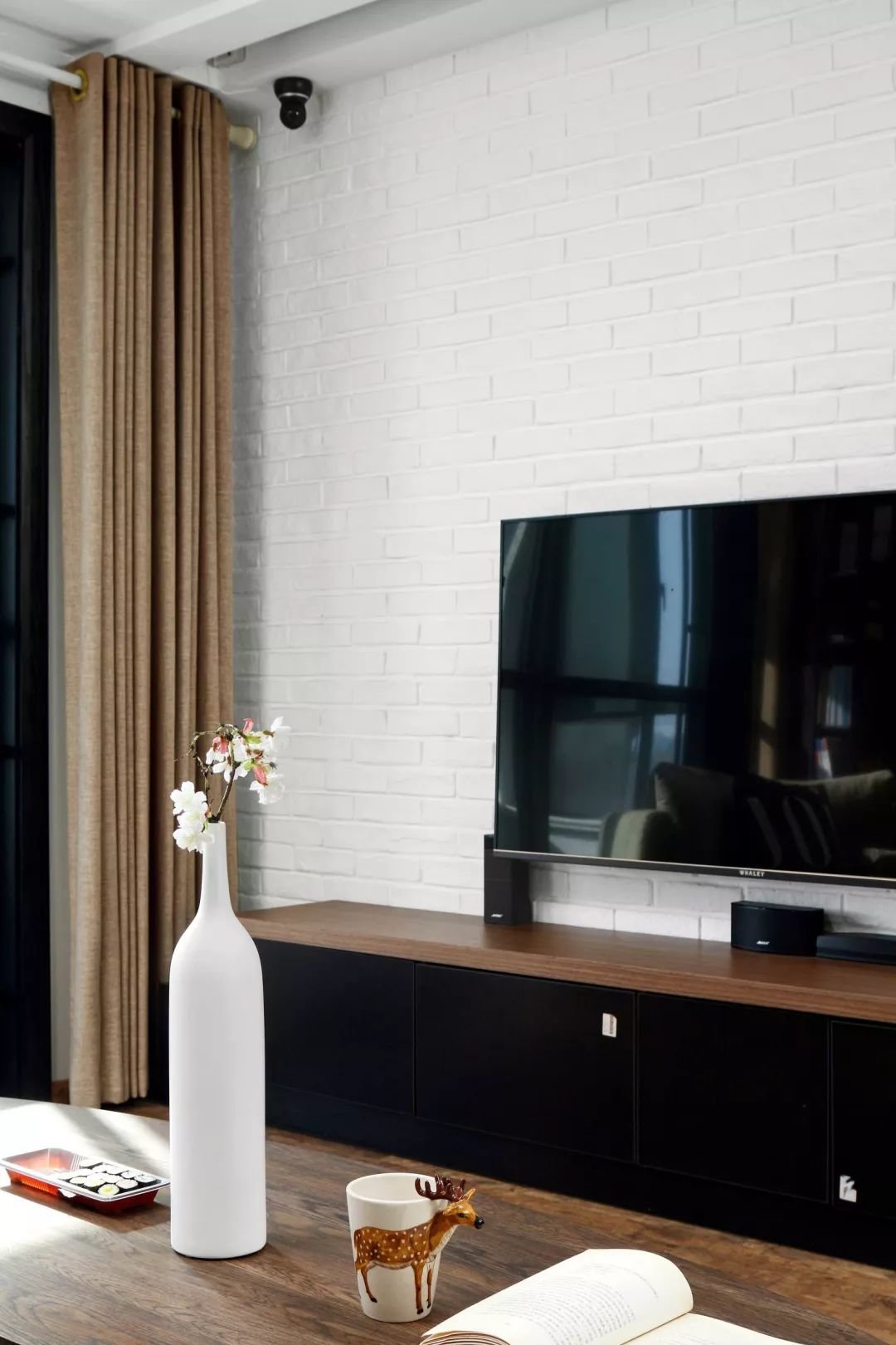 ▲电视墙是白色文化砖,布置实木+黑色门的电视柜,天花上还暗藏了投影幕布,结合茶几上白色花瓶,让空间显得文艺而又雅致。