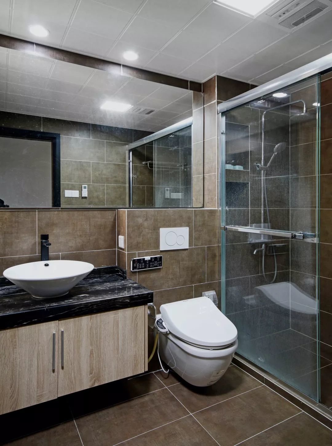 ▲卫生间以脏灰色的地砖与墙砖,让空间显得简约低调而高级;洗手盆采取实木柜体+黑色大理石台面+台上盆台上盆的设计,上方镜柜贯穿马桶上方,让空间收纳强大又实用。