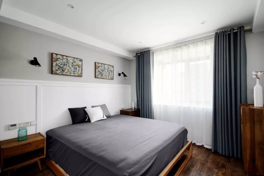 ▲卧室床头墙以白色护墙板的墙脚,墙身则是浅灰色+挂画与壁灯的设计,摆上一张不带靠背的实木床架,铺设灰色床单与灰色窗帘呼应,再以黑白灰抱枕布置,并在两侧布置床头柜、床尾摆上斗柜,让卧室空间显得简约舒适而优雅大气。。