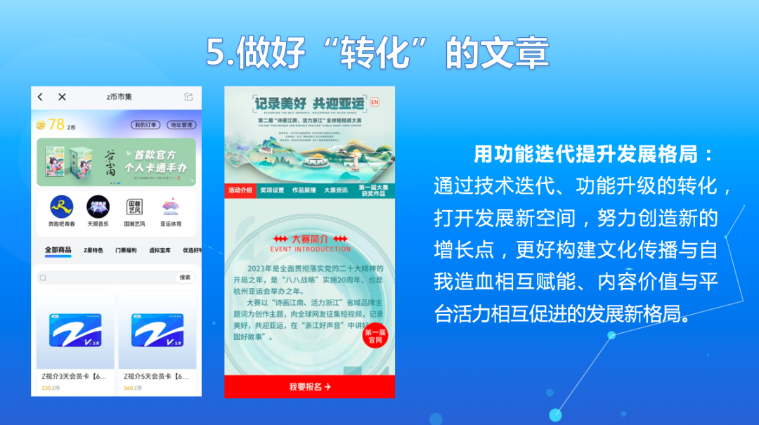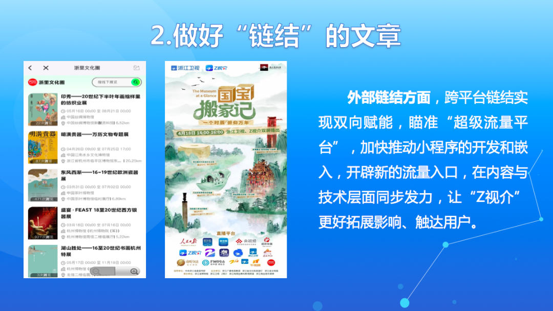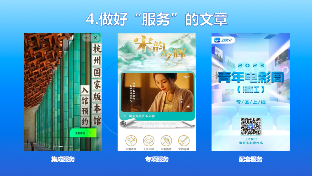 四是做好“服务”的文章。服务是平台的职能。努力实现从“文化内容创作者”到“文化服务供应商”的角色转变。提供集成服务。比如,联动杭州国家版本馆开设参观预约入口并推出相应内容产品;比如,围绕集团公益活动和节目互动提供报名、投票等功能。以此为起点,今后逐步耦合关联各类文化体验场景,着力打造“覆盖浙江、辐射全国”的文化服务一站式平台。推出专项服务。比如,聚焦汇集传世佳作的“宋韵今辉”特展,上线“宋韵今辉”在线展厅,全景呈现、科技加持,打造“永不落幕”的在线展览,让无法现场观展的广大用户通过平台在线一饱眼福。强化配套服务。比如,围绕2023年青年电影周(浙江),“Z视介”不仅全程做好宣推展示,还配套开设了电影票抢兑、电影消费券发放等服务功能,满足用户特定节点时段的文化服务和消费需求。