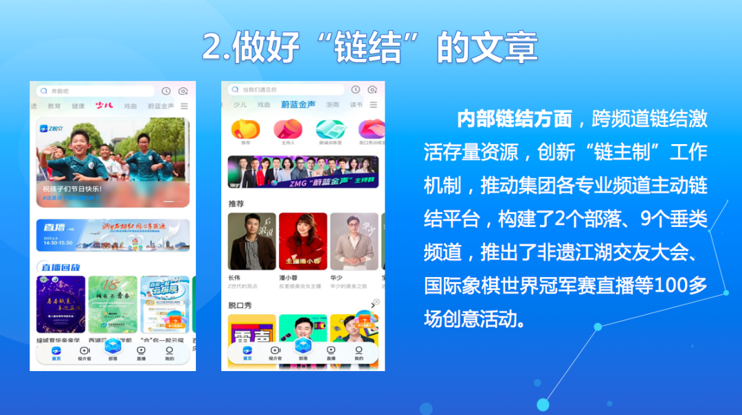 二是做好“链结”的文章。链结是平台的优势。外部链结方面,跨平台链结实现双向赋能,特别是加速与头部互联网平台耦合,试水内容共创、IP与达人联动、联合独播等多元方式,同时瞄准微信、抖音等“超级流量平台”,加快小程序的开发和嵌入,开辟新的流量入口,让“Z视介”更好拓展影响、触达用户。另外,平台还与省文旅厅的数字化应用平台“浙里文化圈”深度耦合,在活动直播、内容共享、传播拓展等方面链结,还围绕浙江省博物馆搬迁,联合创意策划《国宝搬家记》直播活动,形成“近千万网友共同围观国宝搬家”的盛况。内部链结方面,创新“链主制”工作机制,推动专业频道主动链结新平台,构建了2个部落、9个垂类频道,推出了非遗江湖交友大会、国际象棋世界冠军赛直播等100多场创意活动。同时,将《1818黄金眼》等品牌新闻栏目和影视剧创作进行巧妙“链结”,“跨界”催生全新的节目样态。