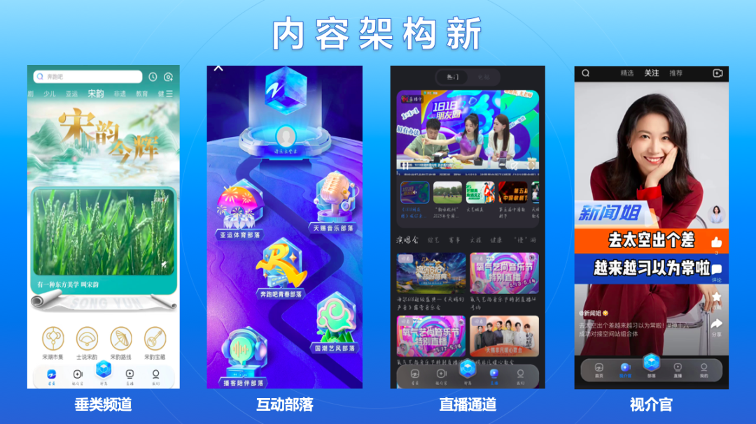 二是内容架构新。“纪录片”“非遗”“戏曲”“宋韵”等专业垂类频道,深挖地域特色,汇聚人文精品,凸现文化特质;“亚运体育”“国潮艺风”“跑男青春”“天赐音乐”“播客陪伴”等互动部落,深耕浙江广电节目品牌IP,共筑内容生态圈;直播通道提供文化活动在线传播、信息服务多元渠道;“视介官”专区通过精心的议题设置、内容组织,打造内容创作者和机构组织集成传播的开放大舞台,已有超过3万名创作者入驻。