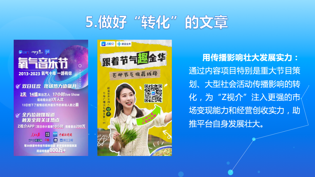 五是做好“转化”的文章。转化是平台的保障。这也是文化视听产业繁荣发展的根本保障。这块工作目前我们还在逐步探索中,总的路径有两个:一是用传播影响壮大发展实力。通过内容项目特别是重大节目策划、大型社会活动传播影响的转化,为“Z视介”注入更强的市场变现能力和经营创收实力,助推平台自身发展壮大。二是用功能迭代提升发展格局。在巩固传统营利模式的基础上,通过技术迭代、功能升级的转化,不断打通价值用户点,衍生流量产品线,拓展市场营销链,努力创造新的增长点。