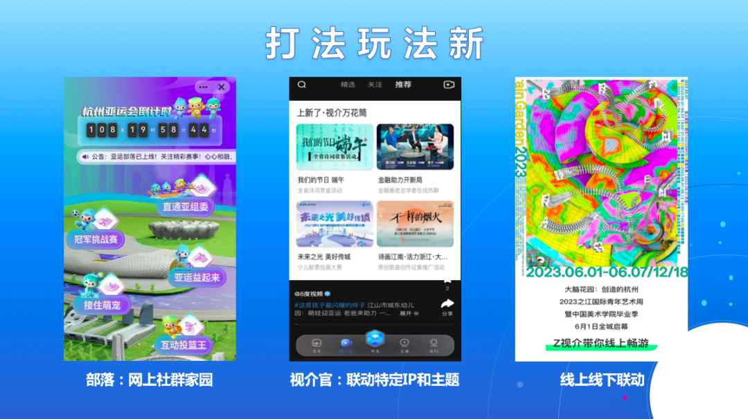 三是打法玩法新。比如“部落”,它不只是把“频道”“专区”换了个名字,而是一个“网上社群家园”,在这里,大家可以分享感受、聊天吐槽、聆听幕后花絮、组织线下活动。比如“视介官”这个版块,不是常见的短视频平台玩法,而是联动特定IP和文化主题,与各类文化名家产生链结、相互交流;又比如,在功能设置方面,我们将文化活动、文旅资源和节目栏目产生关系,形成关联,比如今年中国美院毕业季展览,我们就把线上展示和线下活动打通,产生相互引流赋能的好效果。