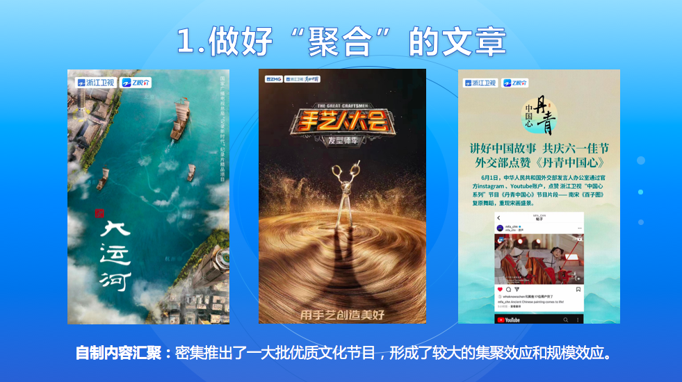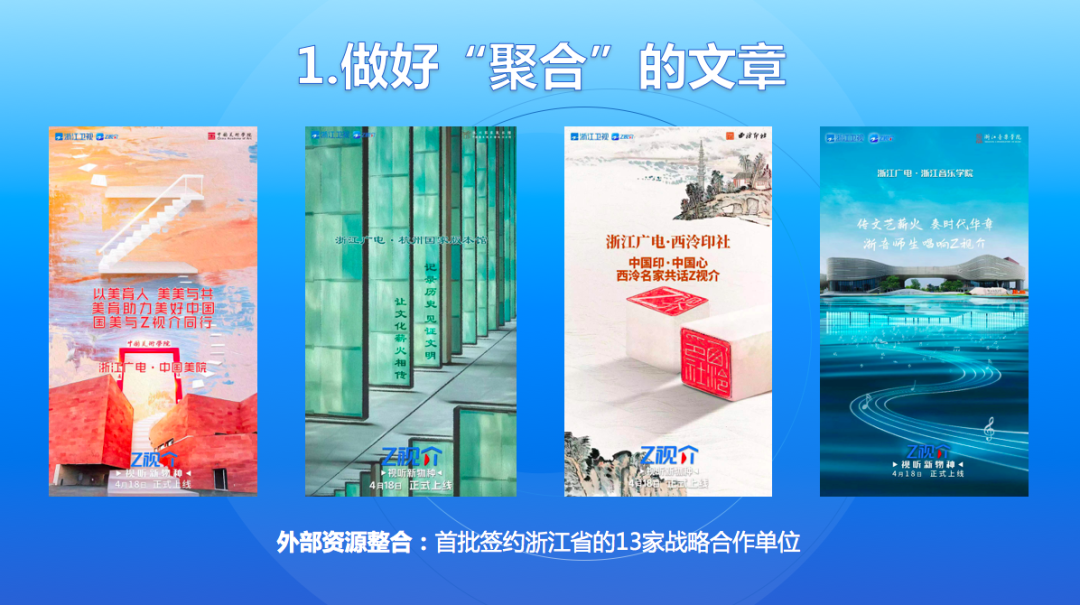 一是做好“聚合”的文章。内容是平台的根本。我们通过大量优质文化内容的汇聚,努力在数量累积的“量变”中,为平台影响的“质变”打下基础。自制内容汇聚方面,我们排兵布阵、全面发力,密集推出了《丹青中国心》《国风·无双》《大运河》《奔跑吧》《当我们遇见你》《手艺人大会》等一大批优质文化节目,形成了较大的集聚效应和规模效应。外部资源整合方面,我们首批签约了浙江省的13家战略合作单位,既有行业主管部门,也有杭州国家版本馆、西泠印社等文化大IP,还有中国美术学院、浙江传媒学院、浙江音乐学院等专业院校。接下来我们还将不断扩大“朋友圈”。