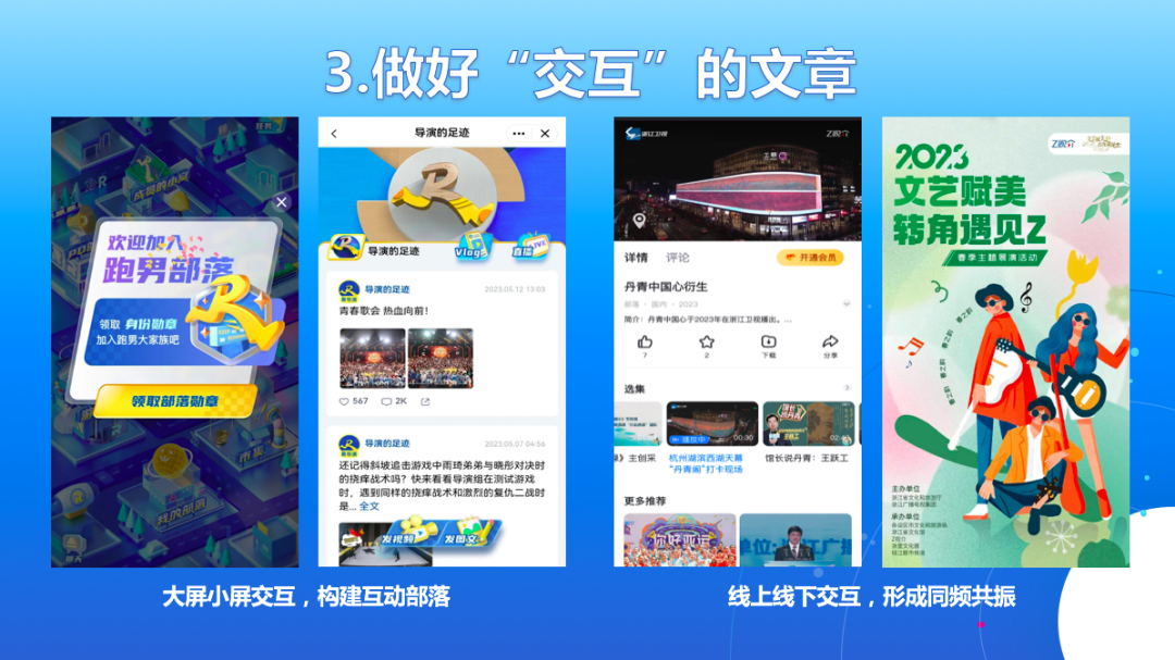 三是做好“交互”的文章。交互是平台的灵魂。一方面,大屏小屏交互,构建互动部落。卫视大屏节目《奔跑吧》在“Z视介”小屏端的“奔跑吧青春部落”设置了工作人员揭秘、录制现场抢先看、互动讨论、独家花絮等版块,形成了“隔屏”的交互赋能;卫视大屏节目《天赐的声音》在“Z视介”小屏端的“天赐音乐部落”推出了“元宇宙天赐飚歌会”“十大高校学生共唱青春”等传播策划,在双屏交互中提升品牌IP的生命力、传播力。另一方面,线上线下交互,形成同频共振。比如,与《丹青中国心》节目线上播出同步,《千里江山图》等宋代名画展示的线下活动也在杭州“西湖天幕”城市景观大屏徐徐展开,从而形成了线上线下的同频共振。再比如,“转角遇见Z”春季主题展演走进浙江各地公园、广场、社区,在线下掀起市民打卡热,同时,通过线上直播和二创推送,形成了更广泛的传播影响。