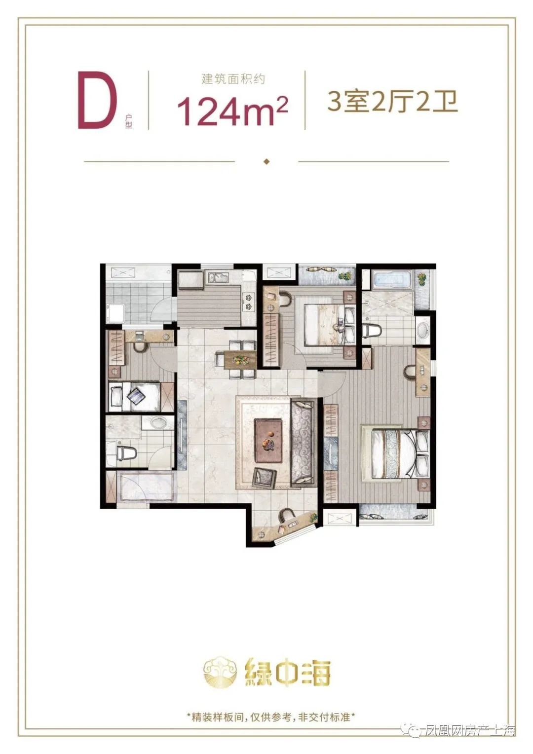 124平方米的户型,虽然主卧实现了南北通透,但其他两个房间均朝北,一个卫生间是暗卫,客厅在中间,也失去了阳台的设计。