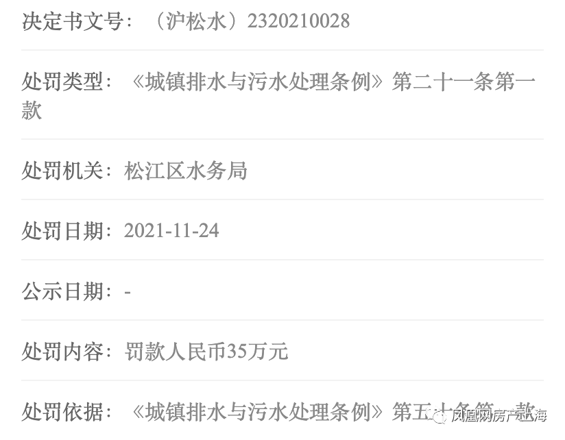该企业2021年在开发建设泗泾绿中海项目过程中实施了未取得污水排入排水管网许可证向城镇排水设施排放污水的行为,被松江税务局罚款35万元。