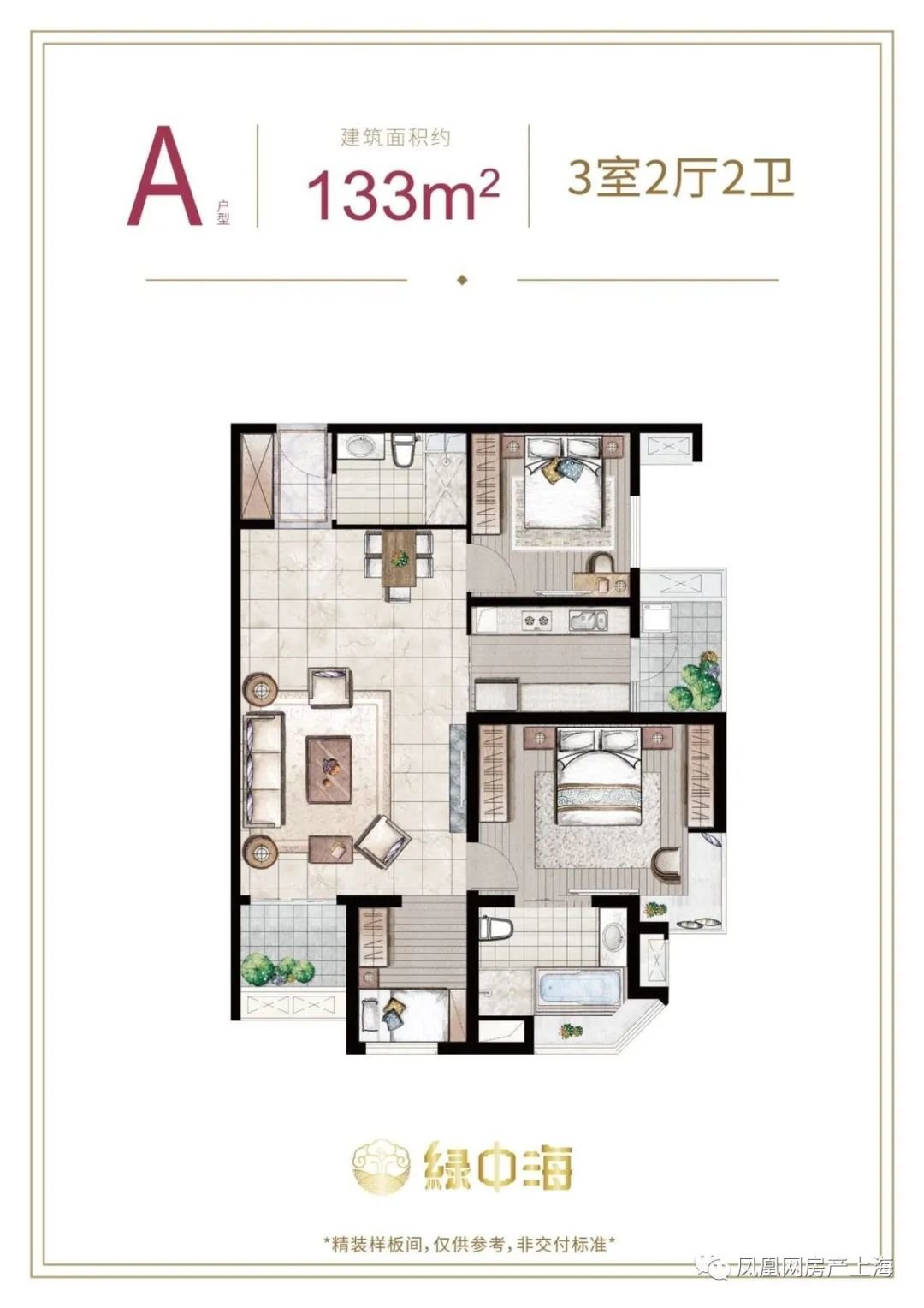 133平方米的户型,两房朝南,一房朝东/西,仅有主卧带飘窗,客厅虽有阳台,但是面积很小,同样有一个卫生间是暗卫。