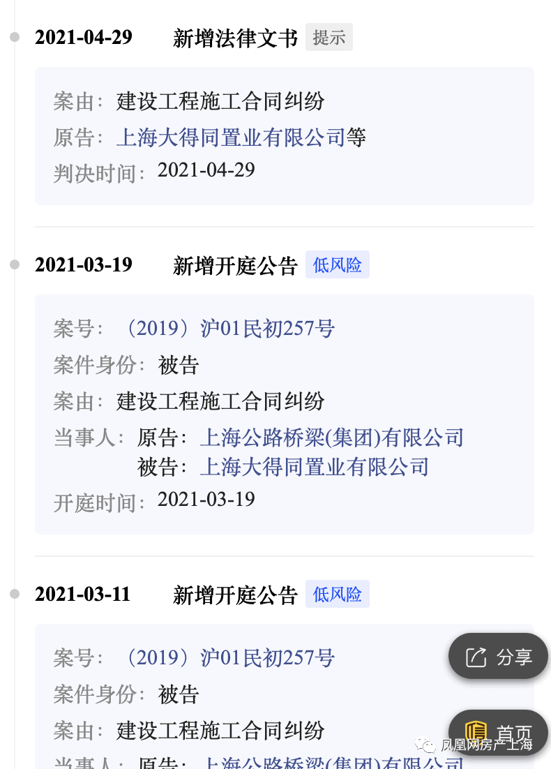 另外,值得注意的是,启信宝显示,上海大得同置业有限公司成立于2002年12月30日。近年来,该企业有过多次法律诉讼,案由多为建设工程施工合同、房屋拆迁安置补偿合同纠纷、股权转让纠纷等。