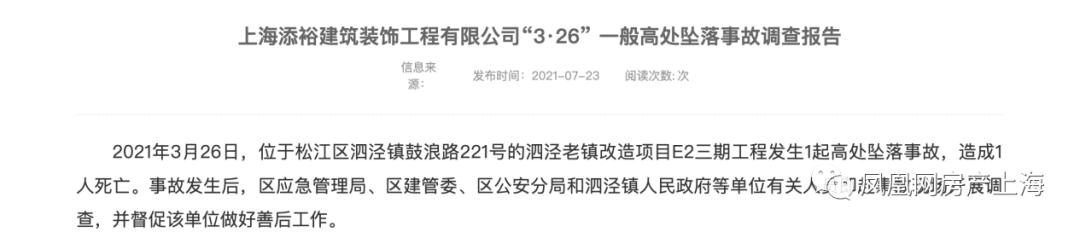 另外,小凤凰还注意到,泗泾老镇改造项目E2地块的三期工程曾发生过安全事故,2021年6月,松江区政府曾发布通报,位于松江区泗泾镇鼓浪路221号的泗泾老镇改造项目E2三期工程发生1起高处坠落事故,造成1人死亡。