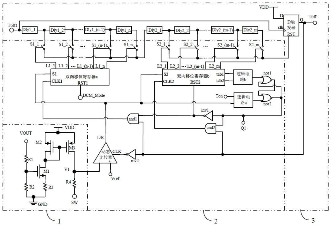 据悉,该发明采用自适应失调电压产生电路产生一个与电源管理芯片的输出电压Vout线性相关的失调电压并叠加到电源管理芯片的低边功率管的漏极电压Vsw上,有效地抑制由于不同电感电流下降斜率而引起比较误差的问题,提高动态比较器的精度及速度;采用动态比较器的反馈作用来控制双向移位寄存器a及双向移位寄存器b,进而精确控制延时链电路的延时时间(即低边功率管的驱动信号端Toff的信号脉宽时间),从而及时关断电源管理芯片的低边功率管,实现一种高精度的过零检测电路。(校对/姜羽桐)