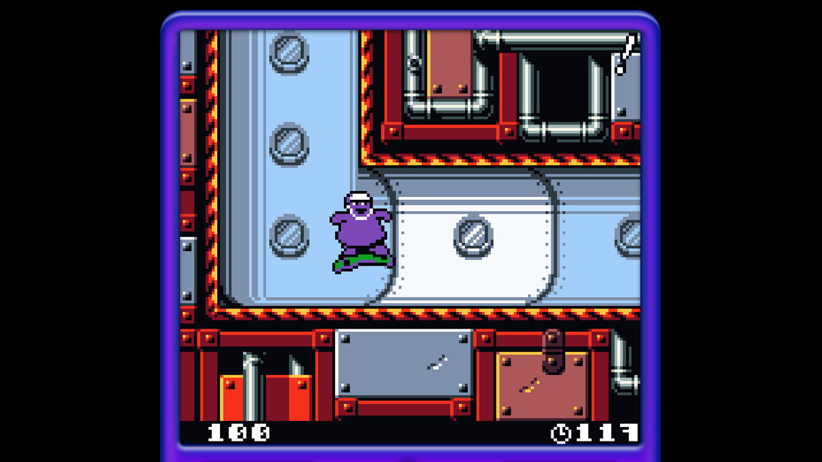 《Grimace's Birthday》是个8位机风格的横版平台动作游戏,主要控制Grimace踩滑板跳跃过关,而且有个小剧情,大概就是Gramace在麦当劳开生日趴体,但快到12点了,他的好朋友汉堡神偷、大鸟姐姐和麦乐鸡兄弟们都没到场,奶昔大哥去找他们,并一边收集Grimace Shake。