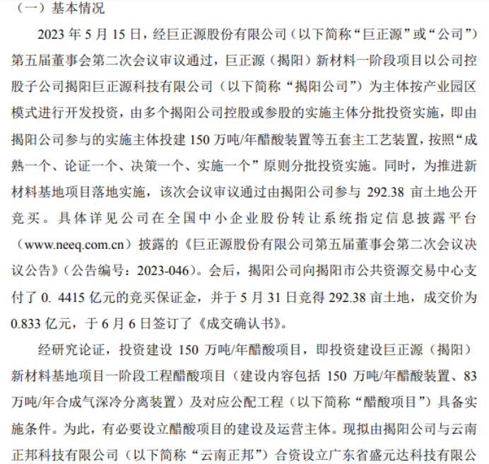 挖贝网6月14日,巨正源(831200)近日发布公告,2023年5月15日,经巨正源股份有限公司(以下简称“巨正源”或“公司”)第五届董事会第二次会议审议通过,巨正源(揭阳)新材料一阶段项目以公司控股子公司揭阳巨正源科技有限公司(以下简称“揭阳公司”)为主体按产业园区模式进行开发投资,由多个揭阳公司控股或参股的实施主体分批投资实施,即由揭阳公司参与的实施主体投建150万吨/年醋酸装置等五套主工艺装置,按照“成熟一个、论证一个、决策一个、实施一个”原则分批投资实施。同时,为推进新材料基地项目落地实施,该次会议审议通过由揭阳公司参与292.38亩土地公开竞买。会后,揭阳公司向揭阳市公共资源交易中心支付了0.4415亿元的竞买保证金,并于5月31日竞得292.38亩土地,成交价为0.833亿元,于6月6日签订了《成交确认书》。