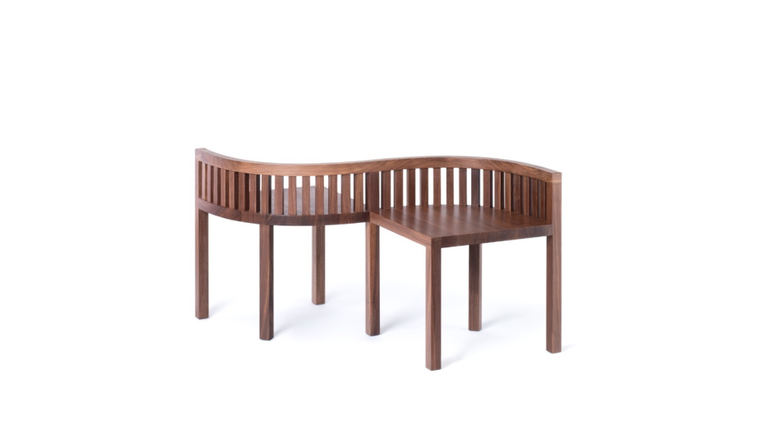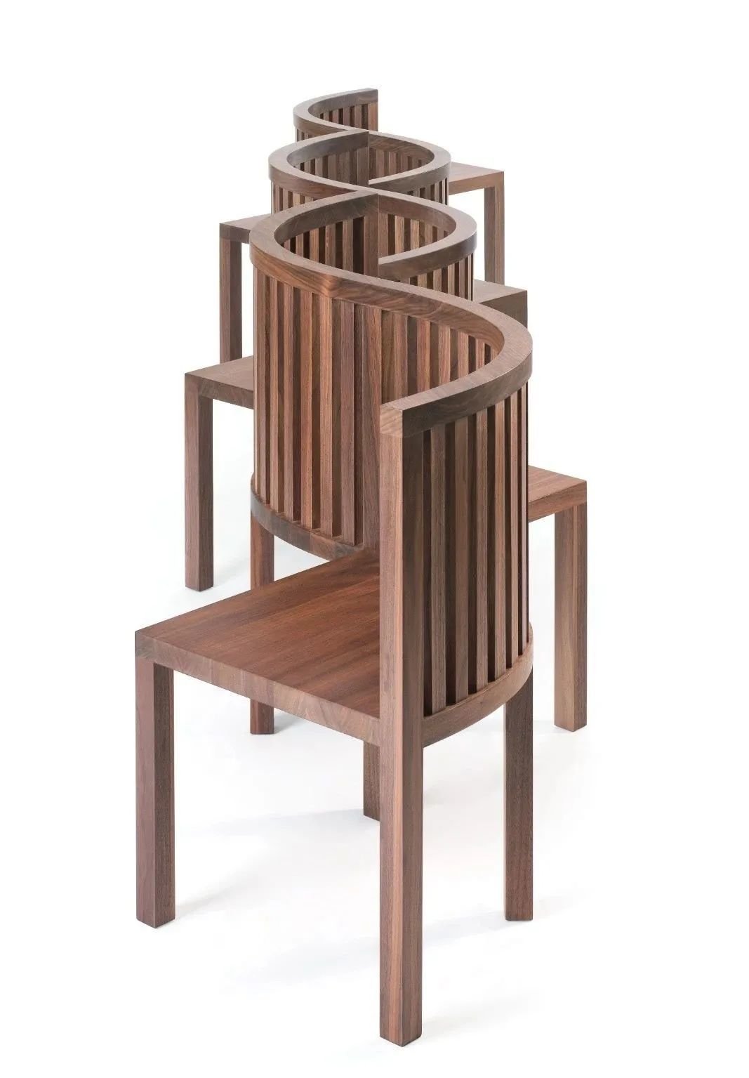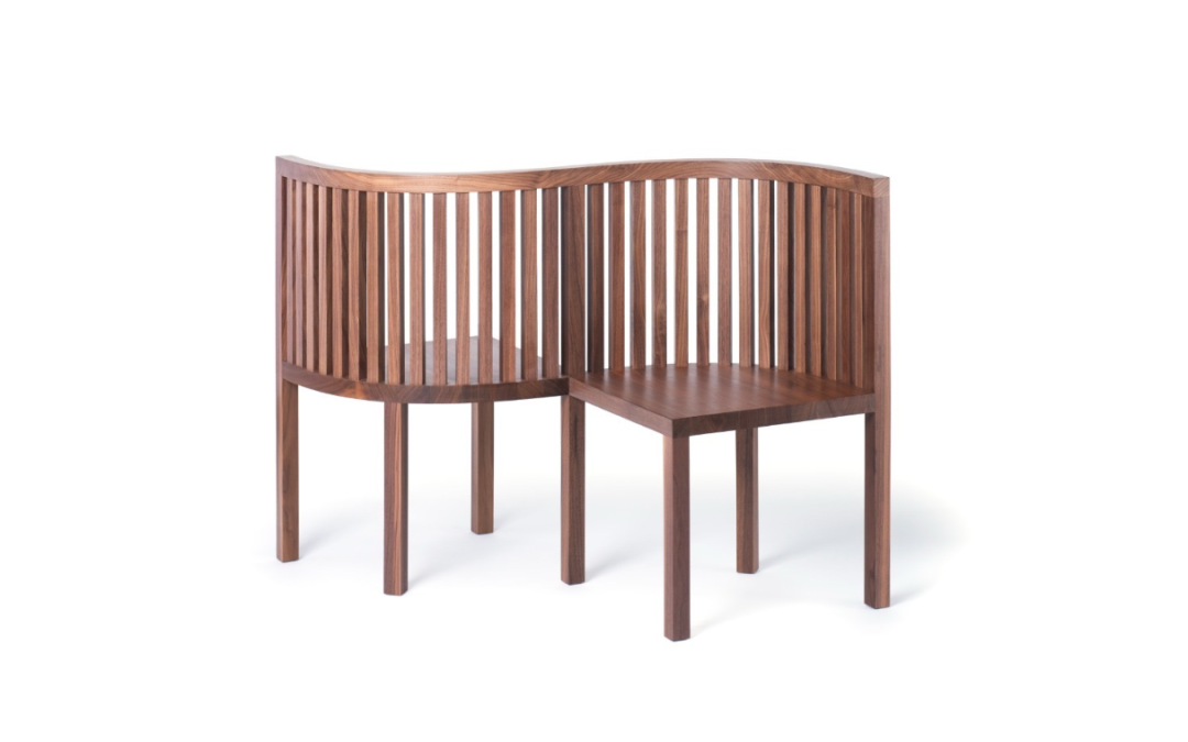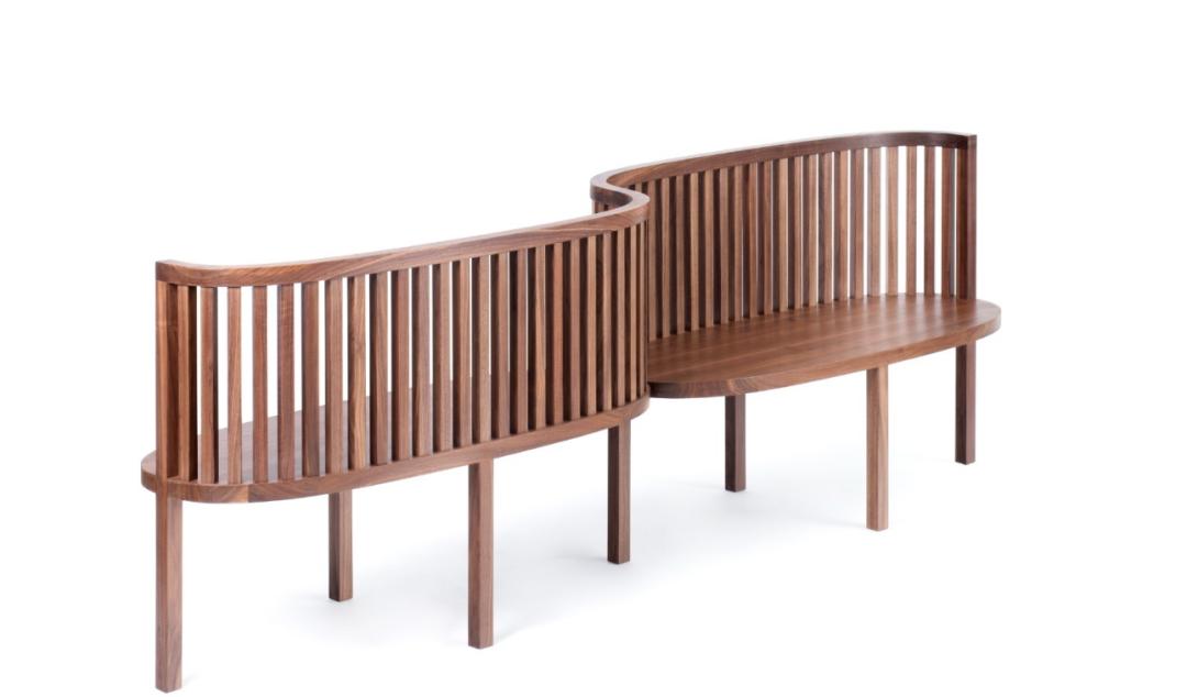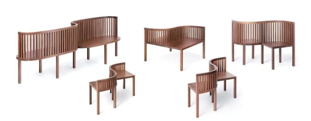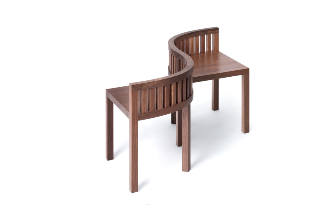 两张椅子通过“S”的流线造型连接,椅背是带有空隙的竖条元素整齐排列组合,给人一种“透气感”。