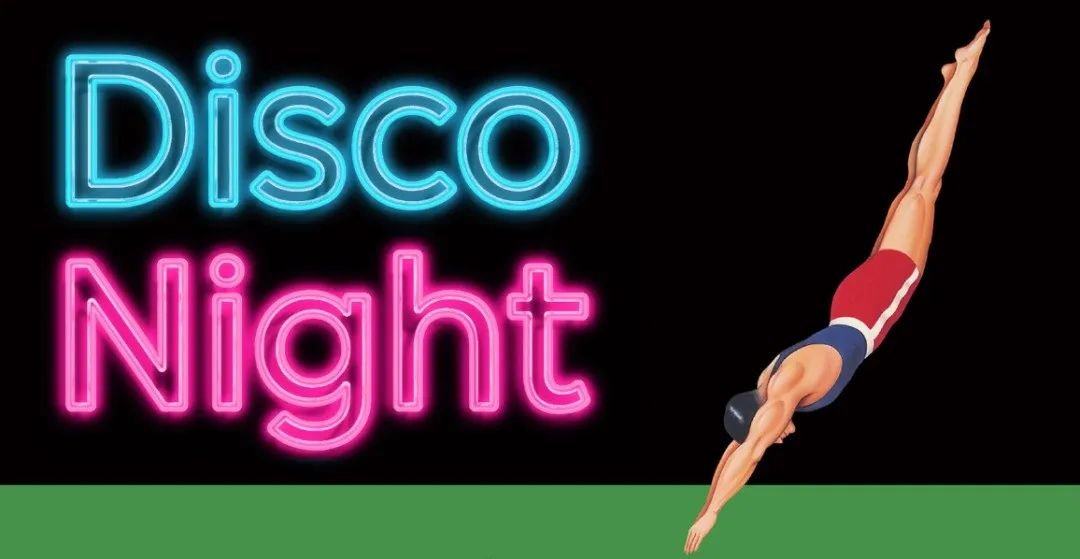 画面主要是一个跳水状态的人搭配荧光色的文案“Disco Night”,画风极具8090年代的复古风格。