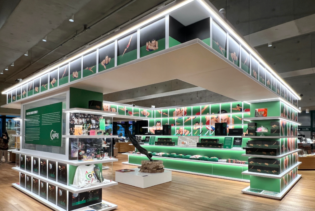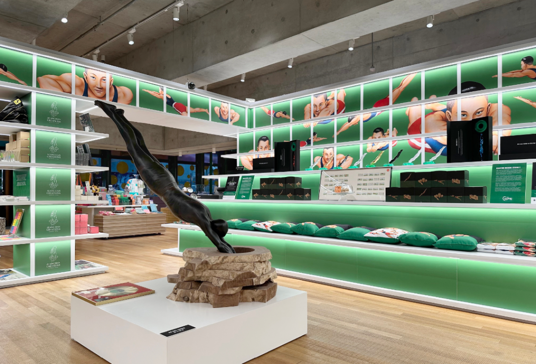 里面展出了系列趣味周边产品,最引人瞩目的就是标志上跳水人物的立体雕塑。