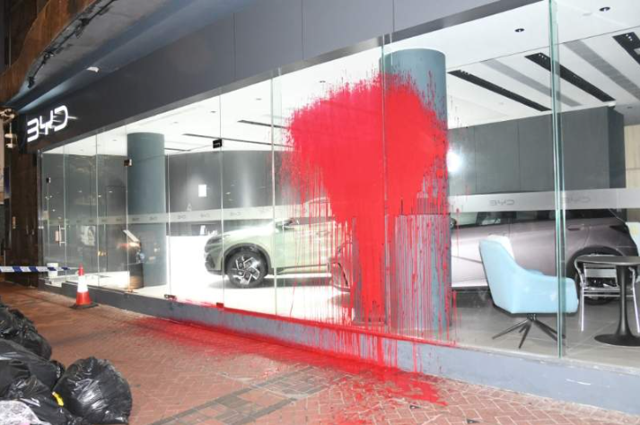 事发于12日凌晨约4时至7时,短短三个小时,比亚迪位于尖沙咀中晶金融中心、元朗雄伟工业大厦、湾仔和天水围的四间门店均遭到破坏。据报道,香港警员凌晨3时57分巡经尖沙咀中晶金融中心时,发现比亚迪陈列室的橱窗玻璃被淋上红漆,地上也留下红漆,范围为约8米乘3米。警员在事发地点附近找到一个2升红漆罐,案件交由尖沙咀刑事调查队调查。