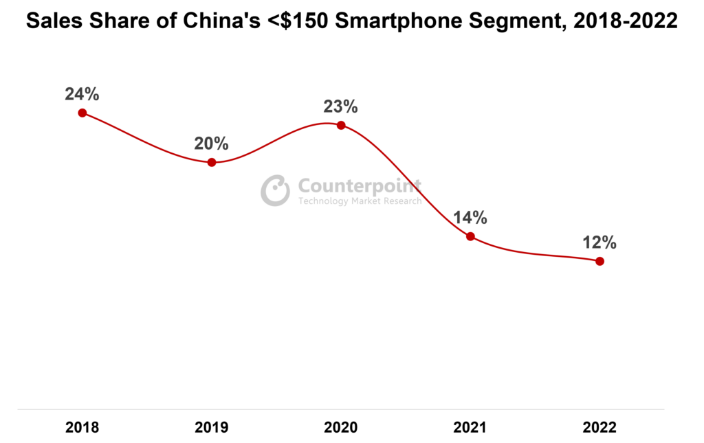 研究机构分析,随着疫情期间芯片短缺的缓解以及原材料成本的下降,手机厂商的制造成本在过去几个季度有所下降,推动了5G通信在入门市场的普及。Counterpoint预测,尽管宏观经济形势不景气,大多数用户还是不会降级选购150美元以下的手机,而是延长现有智能手机的使用时间。如今中国用户智能手机的换机周期已经达到了40个月。