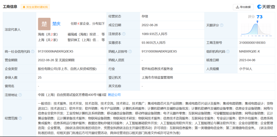 据天眼查App,智识神工成立于2022年,位于上海市,是一家以从事软件和信息技术服务业为主的企业。企业注册资本1089.935万人民币,超过了94%的上海市同行,实缴资本93.9935万人民币,并已于2022年完成了天使轮。