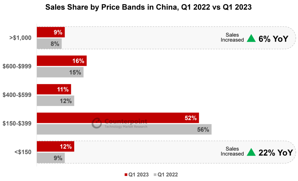 统计显示,2023年一季度150~399美元价位段(人民币1074~2858元)手机的份额最高,达到了52%;400~599美元价位段(人民币2865~4290元)手机占比11%;600~999美元价位段(人民币4297~7155元)手机占比16%;而大于1000美元(7161元人民币)的超高端手机市场,份额增长一个百分点,达到了9%。