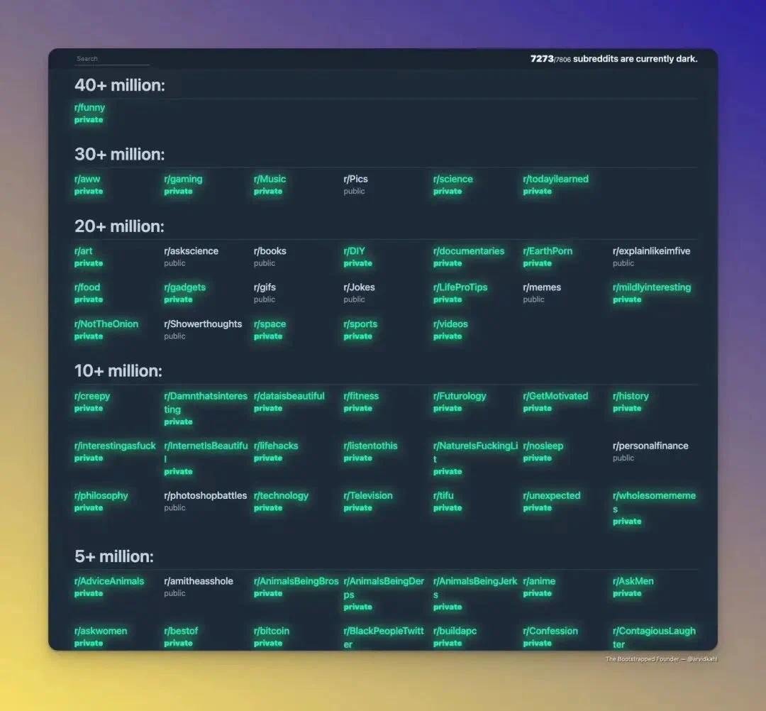 上千万网友揭竿而起,在小组管理员的带领下,自发“ 关闭 ”了 Reddit 上 7000 多个小组,直接把 Reddit 平台干崩了。
