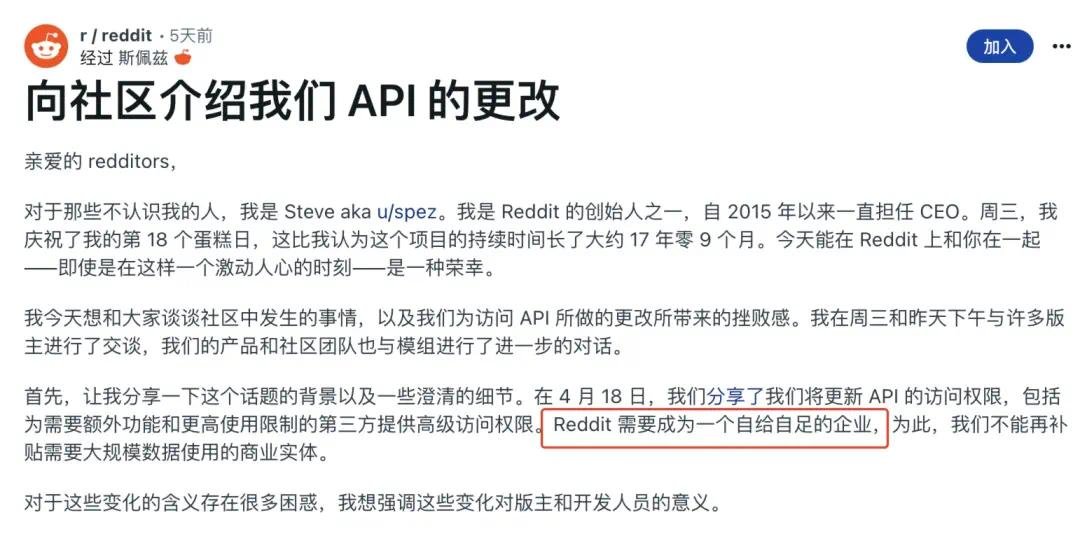 所以这次 Reddit 执意要对 API 收费,其实是想狠狠敲上这些AI大厂一笔,却没想到先“误伤”了第三方客户端。