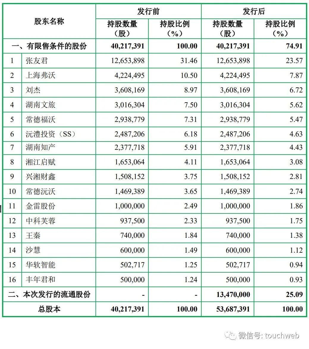 IPO前,张友君持股为31.46%,上海弗沃持股为10.5%,刘杰持股为8.97%,湖南文旅持股为7.5%,常德福沃持股为7.31%,沅澧投资(SS)持股为6.18%,湖南知产持股为5.91%。