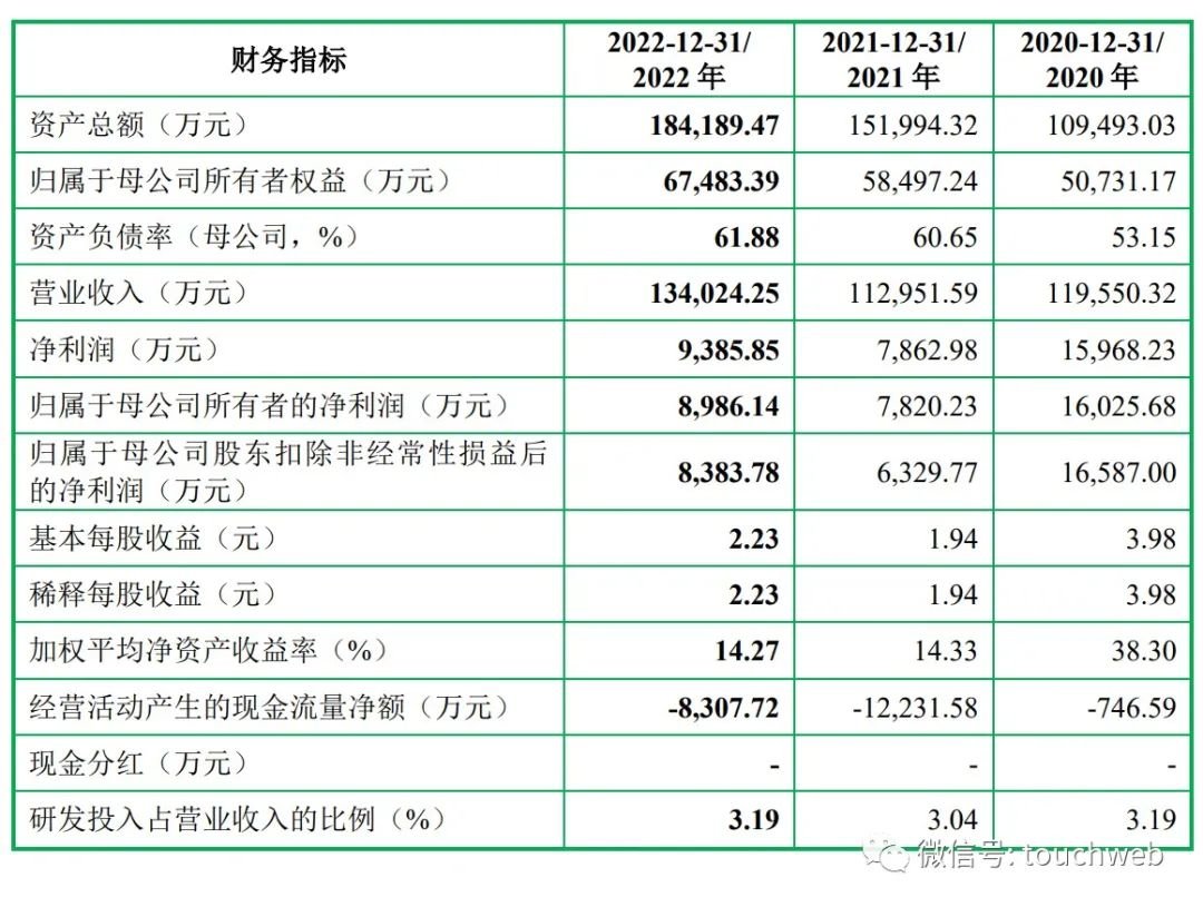 招股书显示,飞沃科技2020年、2021年、2022年营收分别为11.96亿元、11.3亿元、13.4亿元;净利分别为1.6亿元、7862.98万元、9385.85万元;扣非后净利分别为1.66亿元、6329.77万元、8383.78万元。