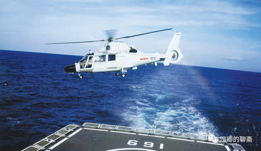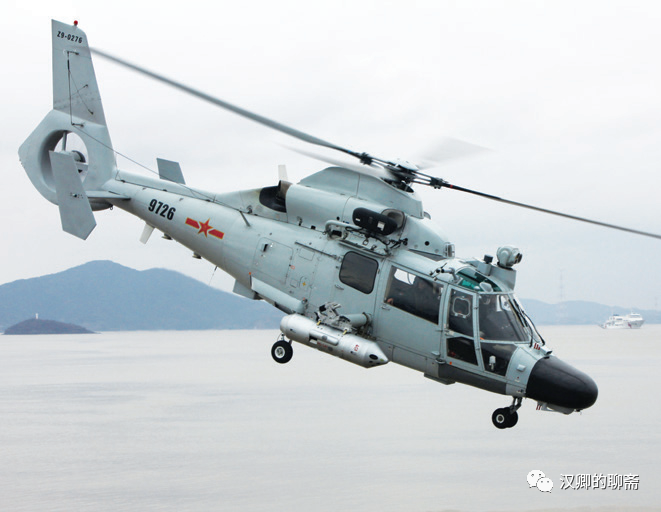 中国引进法国“海豚”直升机后仿制生产了国产型号,也就是直-9型直升机。图为中国直-9型舰载直升机