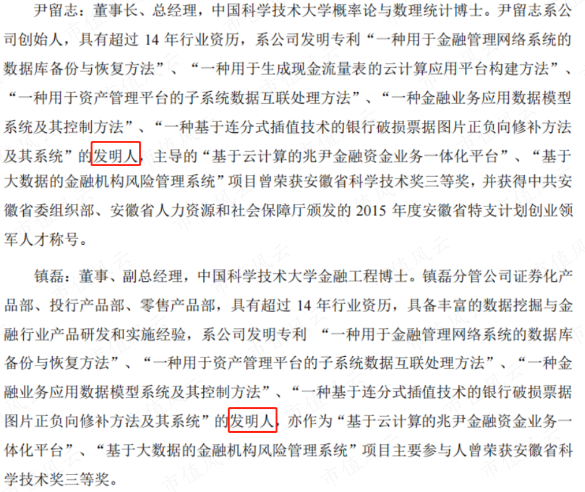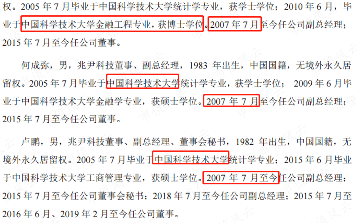 兆尹科技成立于2007年,创始人尹留志和镇磊等主要管理团队成员也都是从公司创业开始一路走到IPO。而且他们都还有很多共同的标签:“80后”、“硕博”、“中国科学技术大学校友”。