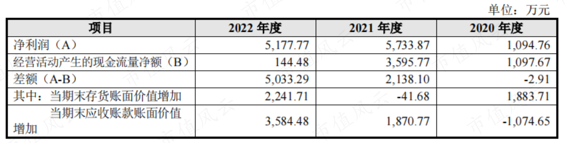 由于存货增加及应收项目的增加,2021年和2022年公司经营活动产生的现金流量净额均低于净利润,且差额越来越大。