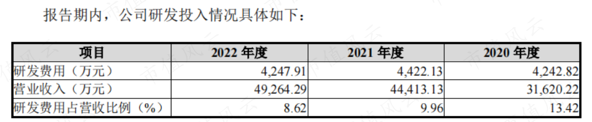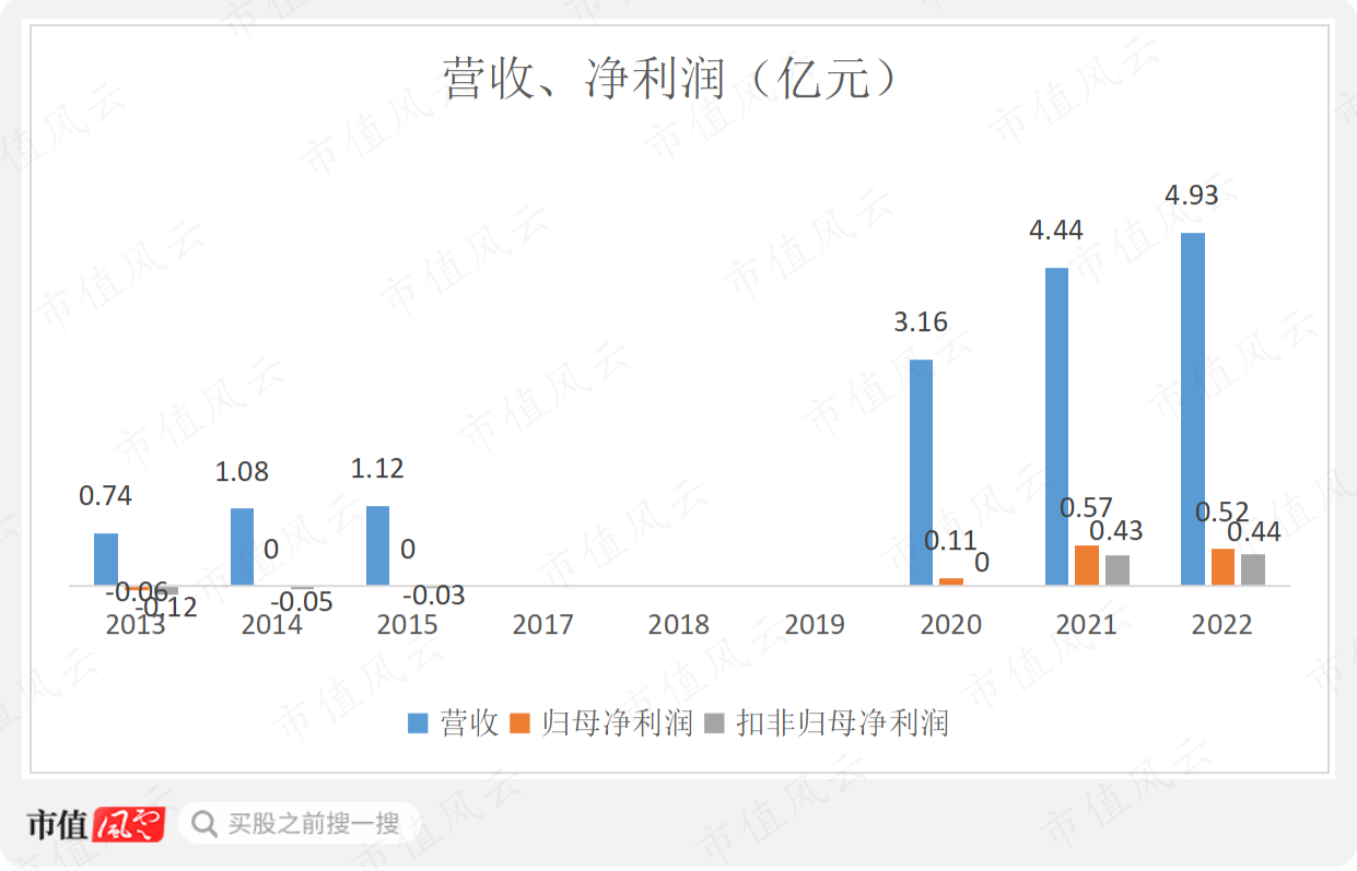 2020-22年,公司营收分别为3.16亿、4.44亿和4.93亿,CAGR为25%,增速还可以。但扣非归母净利润在2020年仅为7万,刚刚实现盈亏平衡,2021年和2022年才实现突破,分别为0.43亿和0.44亿。