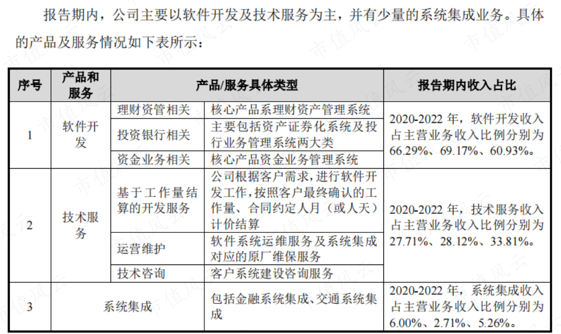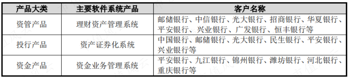 公司为以银行为主的金融机构提供软件开发和技术服务,主要应用于银行的理财资管、投资银行、自营资金投资等相关领域,分别对应公司软件开发业务中的资管产品、投行产品和资金产品。
