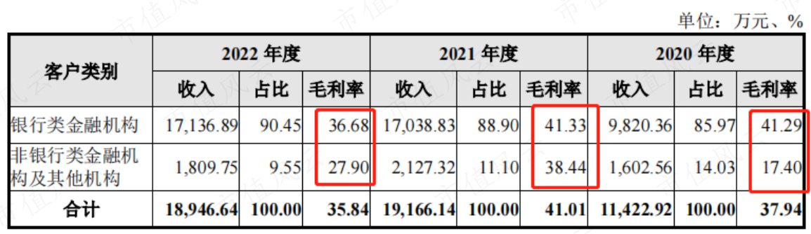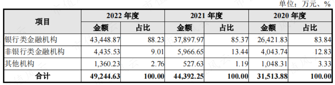 根据客户类型划分,银行类金融客户是公司的主要客户,各年营收贡献均在80%以上,非银行类金融机构和其他机构占比较小。