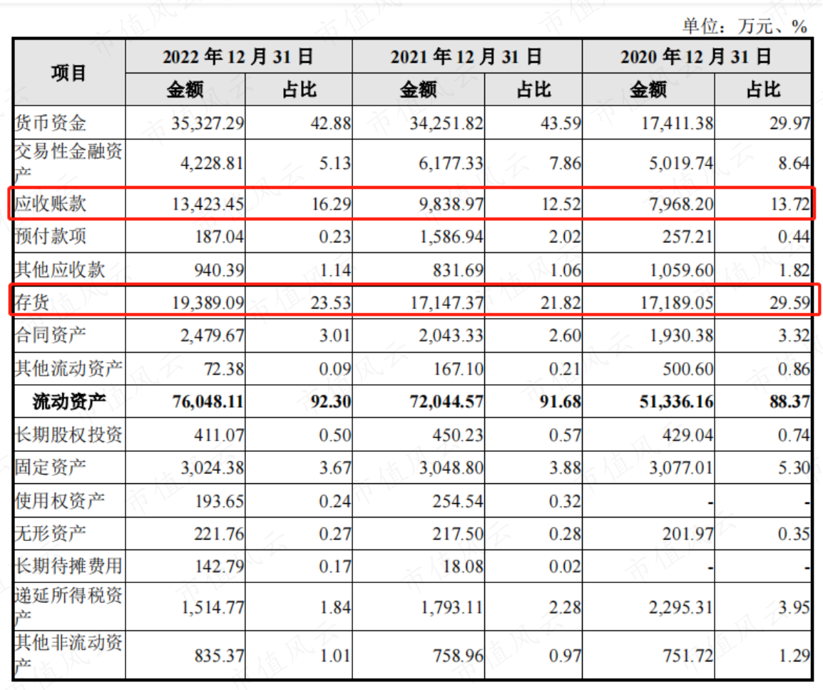 因此公司各期末应收账款和存货金额均较高,占总资产的比例也较高,2020-22年合计占比分别为43%、40%和34%。