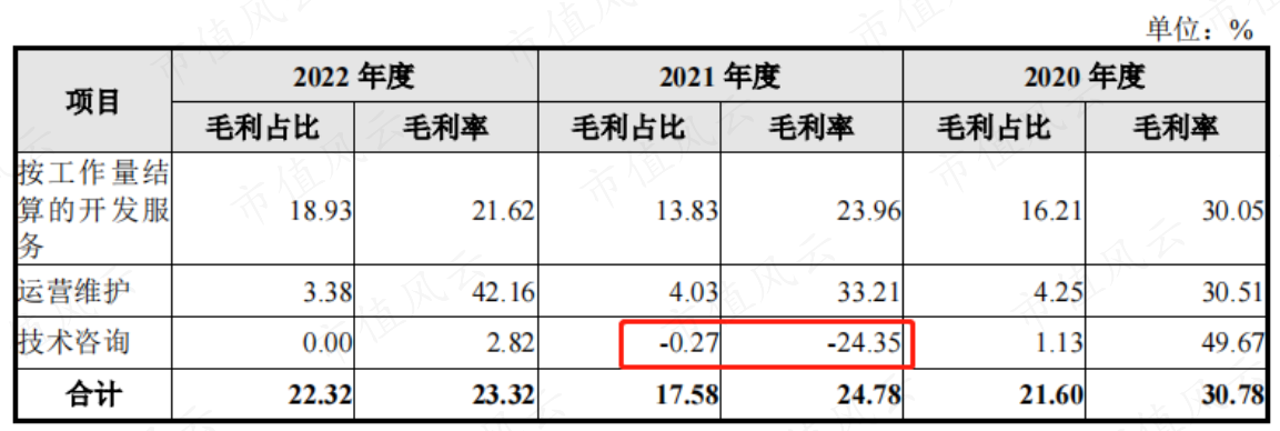 又例如,公司技术服务业务中技术咨询的毛利率波动较大且在2021年为负数,就是因为公司为开拓非银行类金融机构市场,在与部分客户首次合作中,为提高客户满意度人力成本投入较多,项目亏损导致的。
