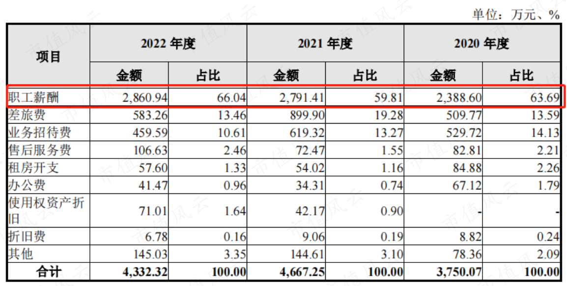 同样的,三项期间费用的主要构成也都是职工薪酬,销售费用、管理费用和研发费用中职工薪酬占比分别在60%、70%和95%左右。