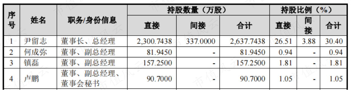 截至目前,实控人尹留志合计持有公司30.4%的股份,何成弥、镇磊和卢鹏分别持有公司0.94%、1.81%和1.05%的股份。