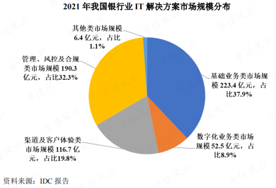 首先,中国银行业IT解决方案市场可以分为基础业务类、数字化业务类、渠道及客户体验类、管理、风控及合规类和其他类。